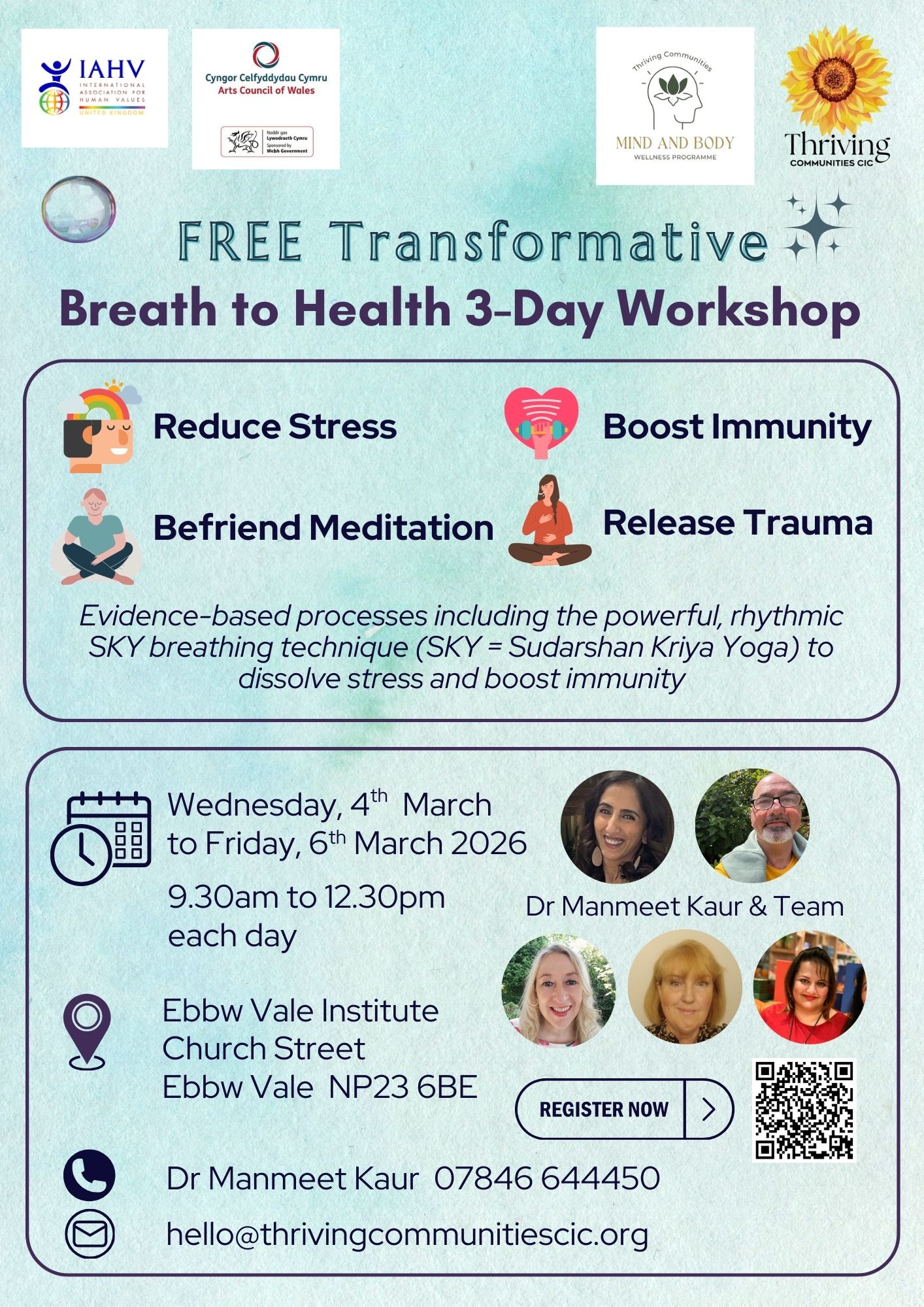 Thanks to funding from the Arts Council of Wales and through the International Association for Human Values, Ebbw Vale Institute and Thriving Communities CIC are able to bring you a FREE 3-day Breath to Health Workshop between 4th and 6th March 2026.